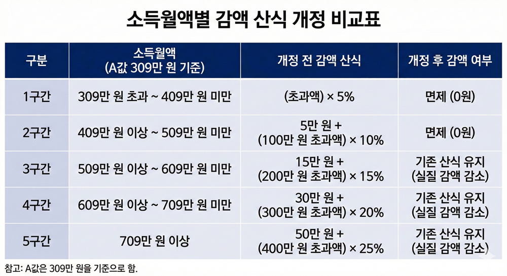 - 기존 1구간: A값 초과 소득 100만 원 미만 (5% 감액) → 폐지(감액 없음)